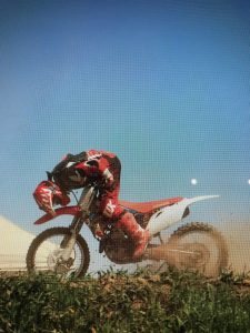 In this case there was problems with others “below” that caused him to “Stop” to avoid landing on top of others! He made it to the ramp, but had to come to a dead stop- from 85 MPH to a dead stop! So he had to basically “Plant” the cycle in the dirt! Collapsing the shocks and literally chest eating the handlebars! His face hit the front tire and left a mark on his forehead.