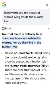 I used finger nail clippers and cut these wart “heads” off for at least 15 years, they constantly grew back! Some people have them frozen off or use chemicals to burn them off. When cutting them off, they can keep growing back for years! Yet, with little children, they can 1 day appear and cover their hands and a few years later, 1 day all be gone! just like they went through a “CYCLE” and that is what a lot of worms do! If the human body is not the true host, the worms will “cycle” and can leave after they have layed enough eggs, etc. AI / Internet today lies a lot–years ago I could find why copper increases hand warts, while today they lie and say there is no such connection!